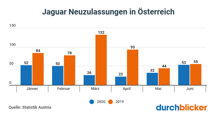 Im Schnitt wurden 2019 im ersten Halbjahr monatlich rund 81 Fahrzeuge der Marke Jaguar in Österreich neu zugelassen. Im ersten Halbjahr 2020 waren es im Schnitt 39 Neuanmeldungen pro Monat: