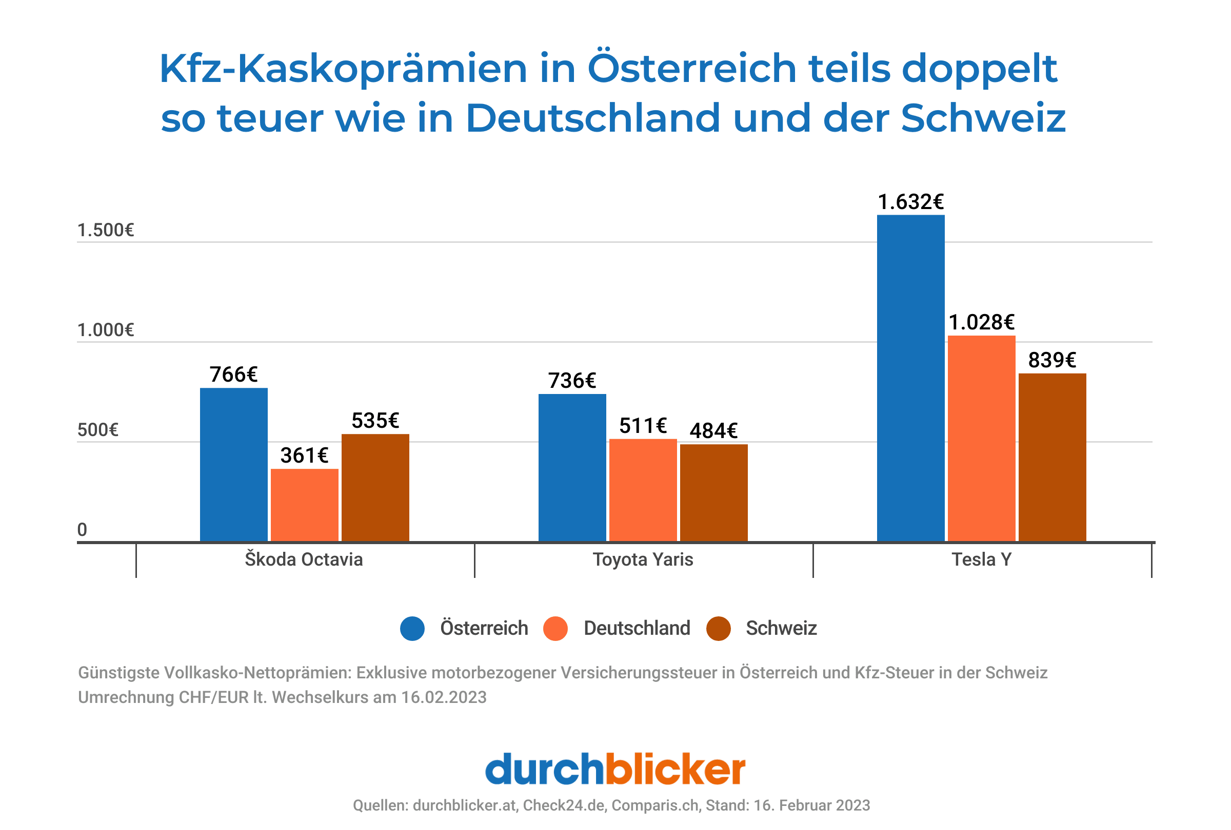 In absoluten Zahlen am höchsten sind die Mehrkosten beim Tesla Y. Für Haftpflicht- und Kasko-Schutz zahlen Tesla-Besitzer in Österreich mit 1.632 Euro im Jahr gleich 793 Euro mehr als in der Schweiz . Und auch für einen Toyota Yaris liegen die Versicherungsprämien in Österreich zwischen 44 und 52 Prozent über jenen von Deutschland und der Schweiz.