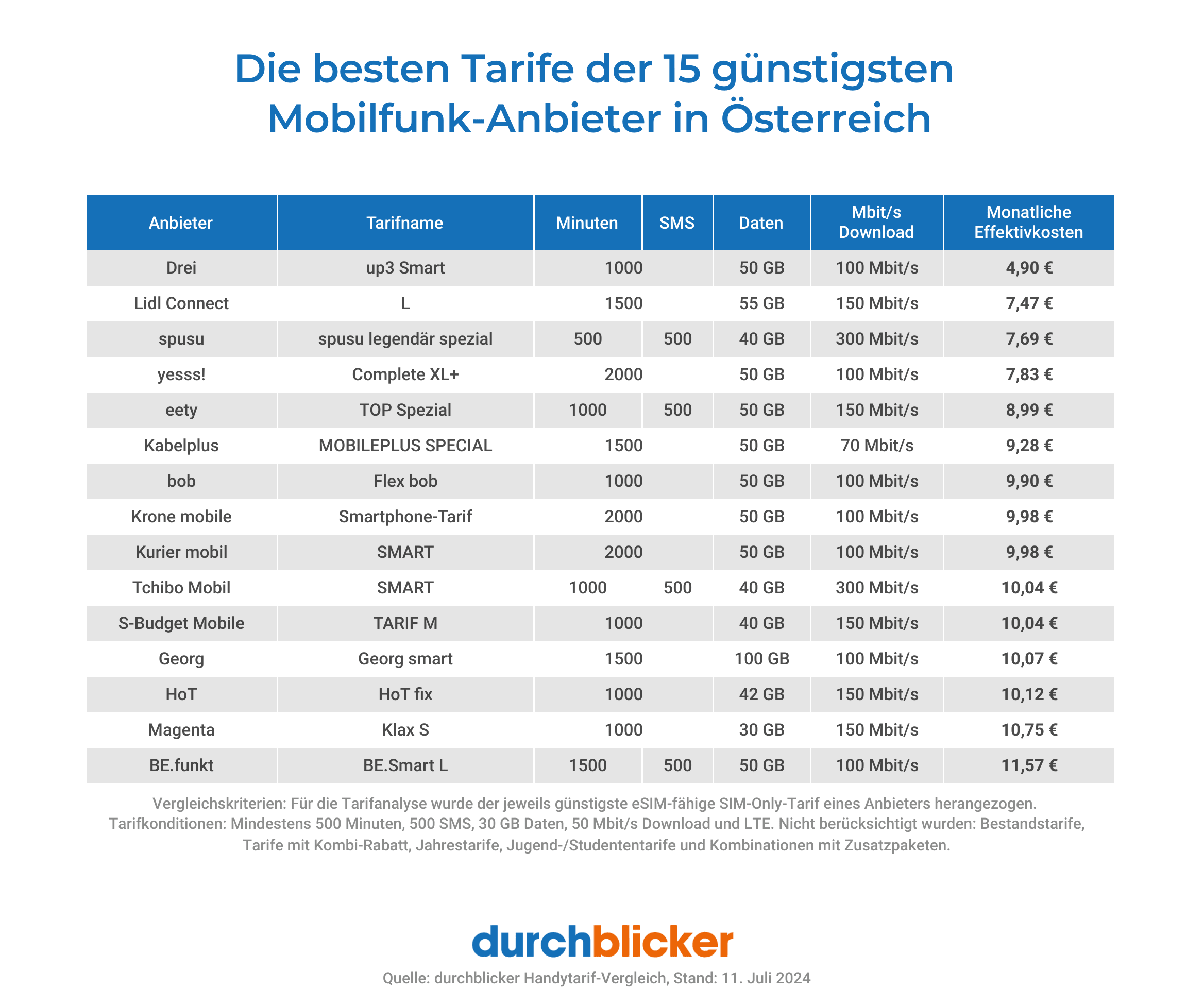 Bei Lidl Connect kostet der Tarif “L” mit 1500 SMS/Minuten und 55 GB Daten aktuell 7,47 € effektiv pro Monat. Ähnlich günstig ist spusu mit dem Tarif “spusu legendär spezial” um effektiv 7,69 € pro Monat, der zwar mit 40 GB etwas weniger Datenvolumen, dafür deutlich höhere Download-Geschwindigkeiten bietet. Dahinter reiht sich yesss! mit dem Tarif “Complete XL+”, wo 50 GB Daten und 2.000 Minuten/SMS im Monat effektiv 7,83 € kosten. Zu den anderen Anbietern der Top 15 gehören u.a. eety (TOP Spezial), Kabelplus (MOBILEPLUS SPECIAL) sowie bob (Flex bob). [1]