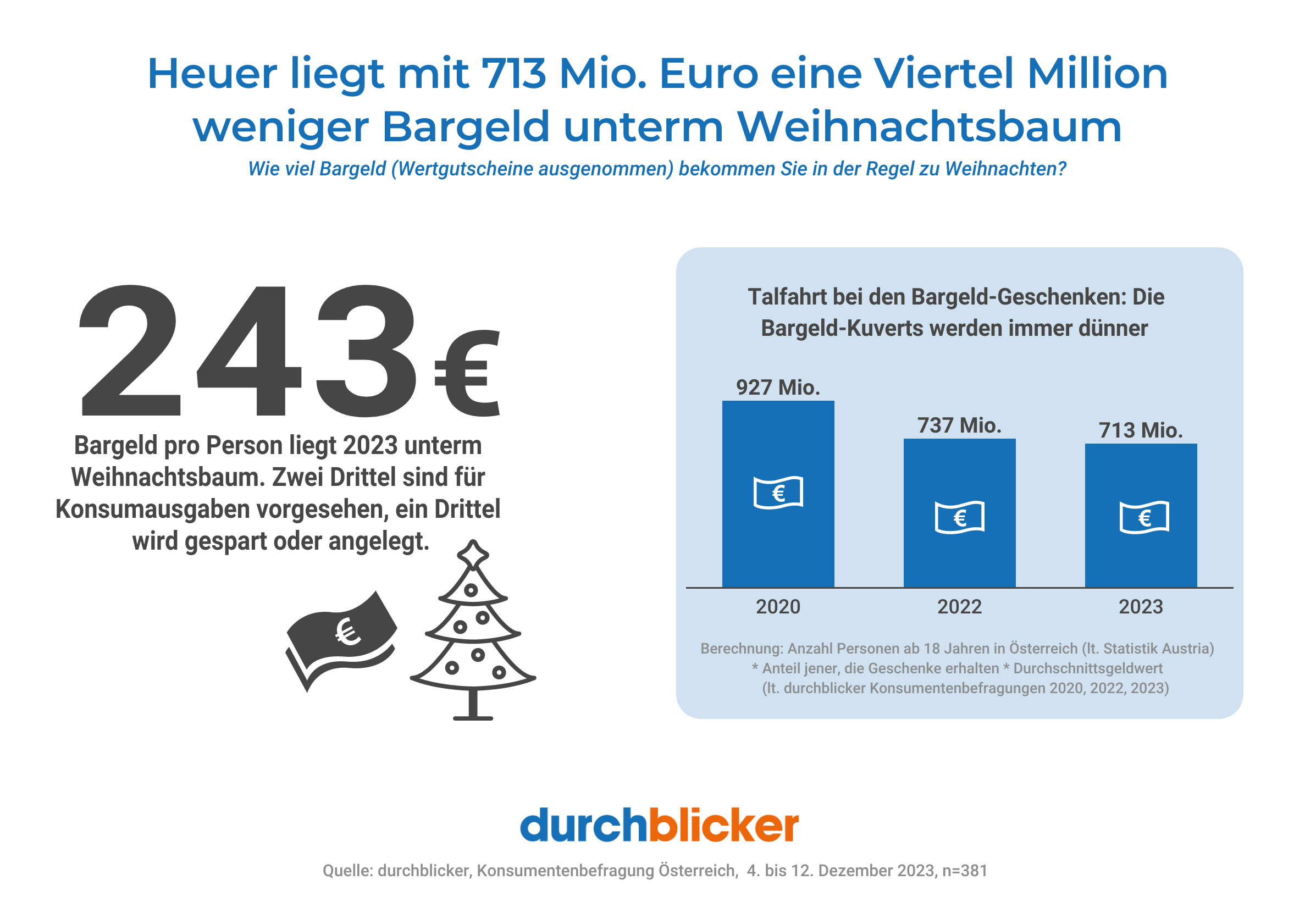 Wien, am 26. Dezember 2023 – Die Bargeld-Kuverts zu Weihnachten werden immer dünner: Wurden 2020 in Summe noch etwa 927 Mio. Euro verschenkt, sind es heuer nur noch 713 Mio. Euro (1) und damit um 24 Mio. Euro weniger als im Vorjahr. Die Kauflaune steigt hingegen: Zwei Drittel der Geldgeschenke werden ausgegeben, der Rest gespart. Im letzten Jahr war es genau umgekehrt. Damit fließen heuer 475 Mio. Euro nach Weihnachten in den Handel, wie aus einer aktuellen durchblicker-Studie (2) unter knapp 1.000 österreichischen Haushalten hervorgeht. Bargeld belegt nach Gutscheinen Platz zwei der häufigsten Weihnachtsgeschenke, gefolgt von Büchern, Kleidung und Schuhen sowie Süßigkeiten.