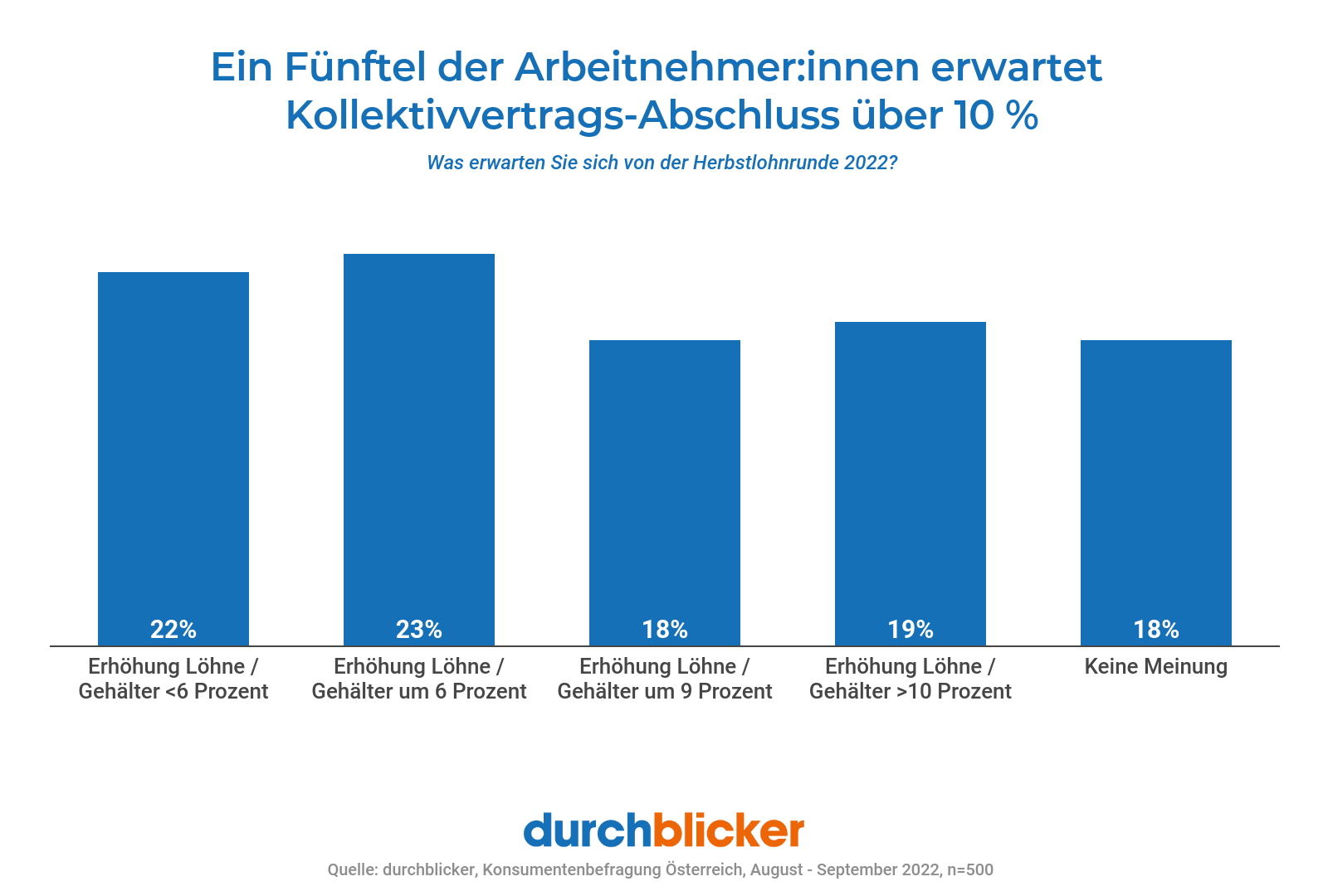 Wien, am 14.10.2022 – Vor der zweiten Runde der Kollektivvertragsverhandlungen bei den Metallern kommenden Montag blickt die Mehrheit der österreichischen Haushalte weiter pessimistisch in die nähere Zukunft. Knapp ein Fünftel rechnet mit einer Anhebung der Kollektivvertragslöhne und -gehälter um mehr als 10 Prozent, etwas mehr als ein Fünftel befürchtet einen KV-Abschluss unter 6 Prozent.