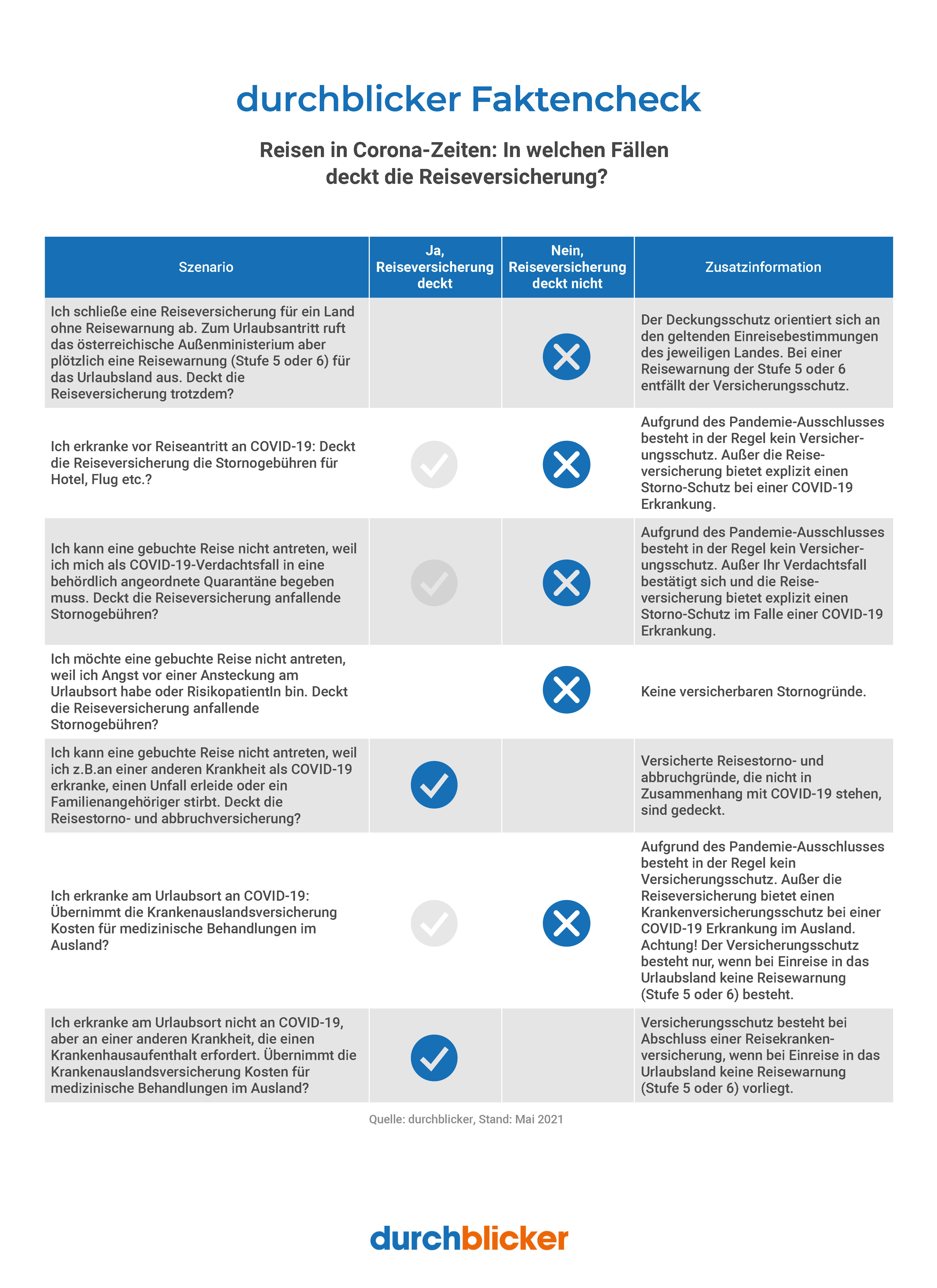 Doch Unsicherheiten bleiben. Umso größer deshalb das Interesse an Reiseversicherungen – und der Frage nach der Deckung bei Ereignissen in Zusammenhang mit Corona. Die Versicherungsexperten von durchblicker, Österreichs größtem Tarifvergleichsportal, haben sich das Thema genauer angesehen.