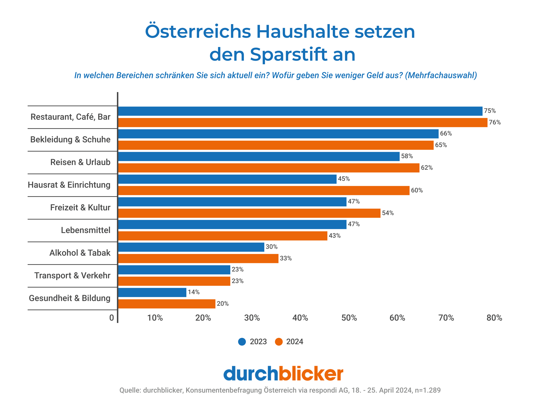 Wien, am 17. Juli 2024. Die ernüchternde Konjunkturprognose der heimischen Wirtschaftsforschungsinstitute WIFO und IHS, die für 2024 mit Stagnation beziehungsweise einem minimalen Plus rechnen, spiegelt sich in der jüngsten Umfrage [1] des österreichischen Tarifvergleichportals durchblicker wider: 91 % der knapp 1.300 befragten Haushalte geben an, ihre Konsumausgaben in den vergangenen sechs Monaten eingeschränkt zu haben, mehr als ein Drittel spricht sogar von starken Einschränkungen. Gespart wird – wie schon im Herbst des Vorjahres – vor allem bei Restaurantbesuchen (76 %), Bekleidung und Schuhen (65 %) sowie Reisen und Urlaub (62 %). Ein deutlicher Anstieg ist heuer aber auch bei Einrichtungsgegenständen & Haushalt (57 %, +12 Prozentpunkte) und Freizeit & Kultur (54 %, + 7 Prozentpunkte) zu verzeichnen.
