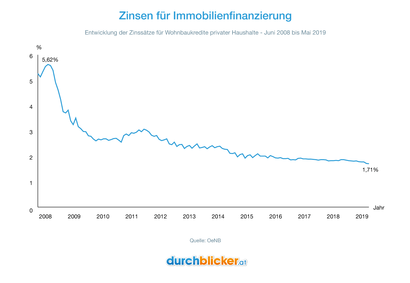 Die Finanzierung einer eigenen Wohnung oder eines eigenen Wohnhauses war noch nie so günstig wie jetzt. Nach den Daten der Oesterreichischen Nationalbank (OeNB) zahlten private Haushalte für einen neuen Wohnbaukredit im Mai nur noch 1,71 Prozent Zinsen – so wenig wie noch nie in den vergangenen 25 Jahren. Grund dafür ist die anhaltende Nullzinspolitik der Europäischen Zentralbank, aber auch der zunehmende Wettbewerb zwischen den Banken. Bei einem offenen Kreditbetrag von 250.000 Euro und einer Restlaufzeit von 20 Jahren liegen die Zinsen der attraktiven Angebote aktuell zwischen 0,45 Prozent variabel und 1,5 Prozent fix auf die gesamte Laufzeit, so eine aktuelle Erhebung des größten österreichischen Tarifvergleichsportals durchblicker.at.