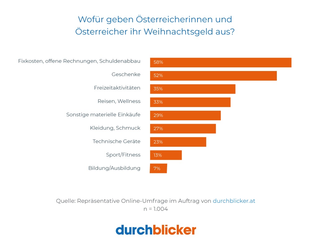 Pünktlich zum Adventbeginn hat die Mehrheit der Österreicherinnen und Österreicher ihr „Weihnachtsgeld“, das 14. Gehalt, erhalten, um damit ihre Weihnachtseinkäufe zu finanzieren. Doch wofür nutzt die Nation ihr Weihnachtsgeld tatsächlich? durchblicker.at, Österreichs größtes Tarifvergleichsportal, ist dieser Frage mittels einer österreichweit in Auftrag gegebenen repräsentativen Umfrage – wie bereits im letzten Jahr – auch heuer auf den Grund gegangen. Dazu wurden insgesamt 1.000 berufstätige Österreicherinnen und Österreicher befragt. Es zeigte sich: Die Österreicherinnen und Österreicher sind auch dieses Jahr in finanzieller Hinsicht stark auf ihr 14. Gehalt angewiesen. Bereits mehr als jeder zweite Österreicher (58 Prozent) benötigt sein Weihnachtsgeld, um seine Fixkosten* oder offenen Rechnungen zu zahlen, oder Schulden zu tilgen. Am meisten betroffen sind im Bundesländervergleich die Niederösterreicher – bereits zwei von drei – sowie Vorarlberger und Kärntner – ebenso deutlich mehr als jeder Zweite. Ausgabegrund Nummer 1 ist für mehr als die Hälfte der Befragten der Kauf von Weihnachtsgeschenken. Weitere relevante Ausgabenblöcke sind Freizeitaktivitäten, Essen und Trinken, Reisen und Wellness.