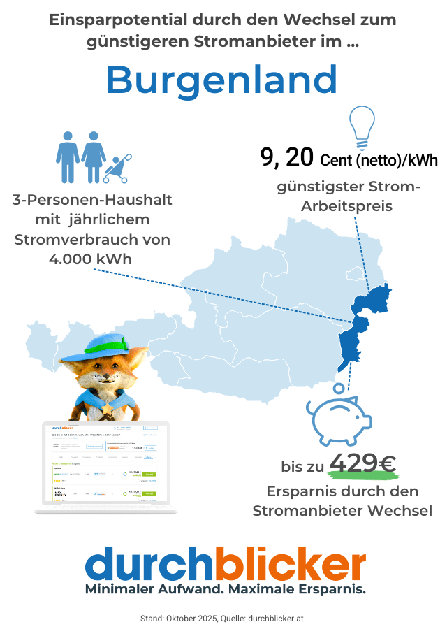 Im Burgenland können Sie durch einen Stromanbieterwechsel im Schnitt 429€ sparen. Der günstigste Strom-Arbeitspreis fürs Burgenland beginnt bei rund 9,20 Cent (netto) pro kWh. Wechseln Sie jetzt zum günstigen Tarif: