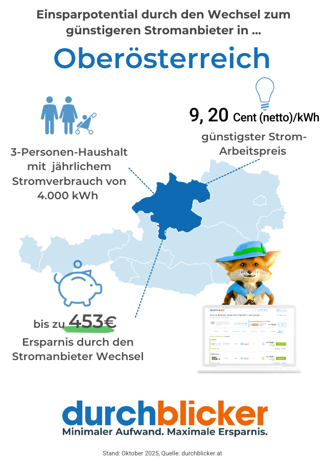 In Oberösterreich können Sie durch einen Stromanbieterwechsel im Schnitt 453 € sparen. Der günstigste Strom-Arbeitspreis für Oberösterreich beginnt bei rund 9,20 Cent (netto) pro kWh. Wechseln Sie jetzt zum günstigen Tarif: