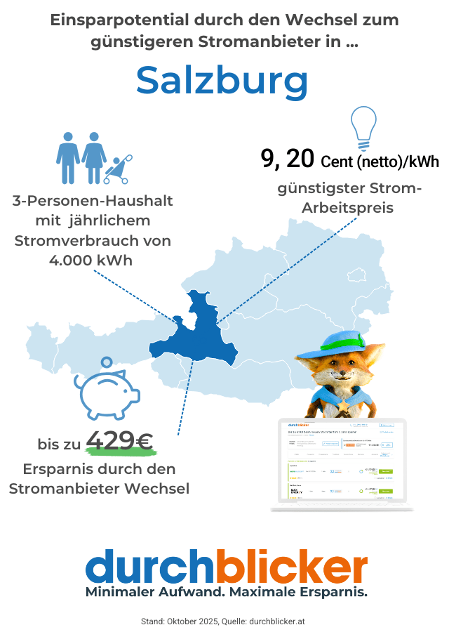 Der aktuell günstigste Strom-Arbeitspreis (netto ohne Umsatzsteuer) liegt in Salzburg bei 9,20 Cent pro kWh – der Vergleich lohnt sich also in jedem Fall.