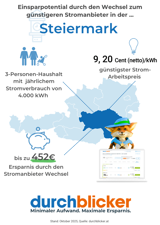 In der Steiermark können Sie durch einen Stromanbieterwechsel im Schnitt 452 € sparen. Der günstigste Strom-Arbeitspreis für die Steiermark beginnt bei rund 9,20 Cent (netto) pro kWh. Wechseln Sie jetzt zum günstigen Tarif: